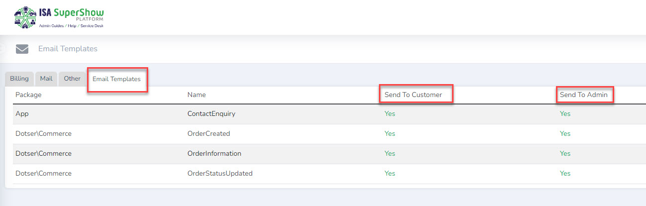 To enabled or disable any of the email templates, check the individual settings on the list view.
