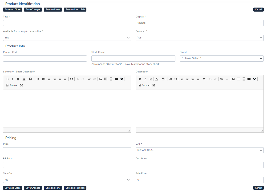 - Summary / Description Fields - These provide text description area for products. You can use the description box to insert video clips of a product in action.