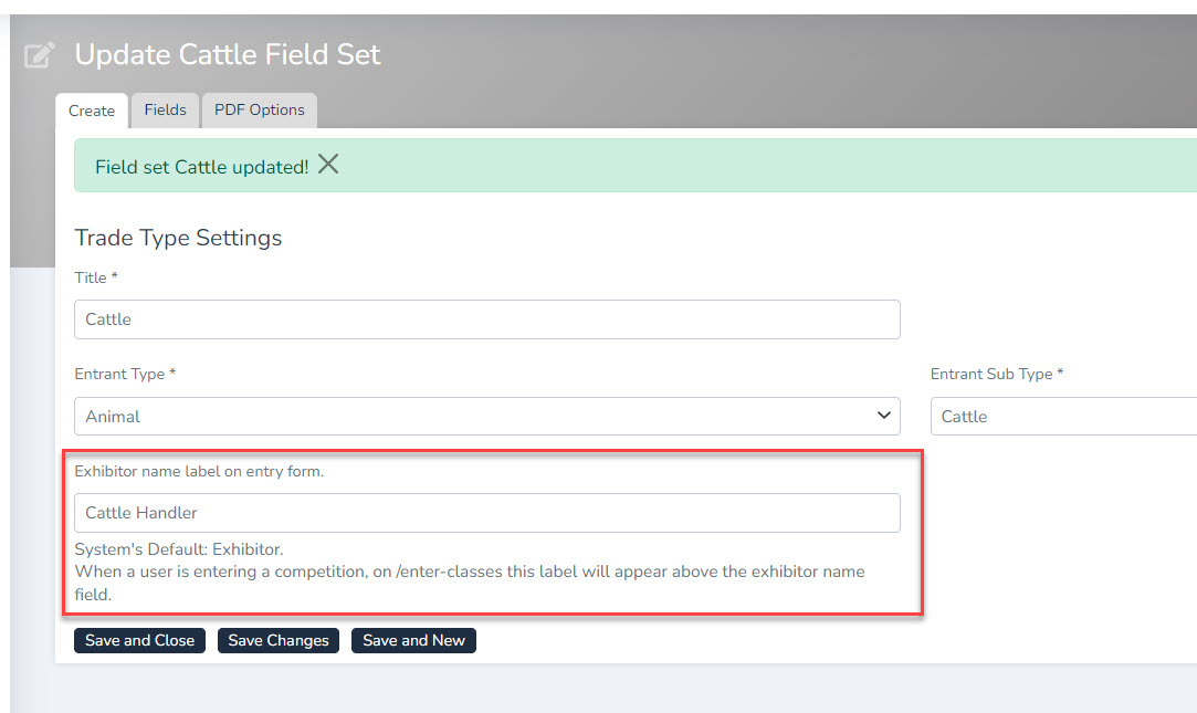 - Enter a new label in the Exhibitor name label on entry form field.